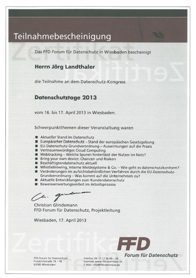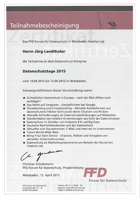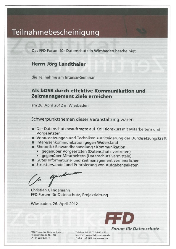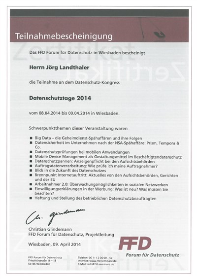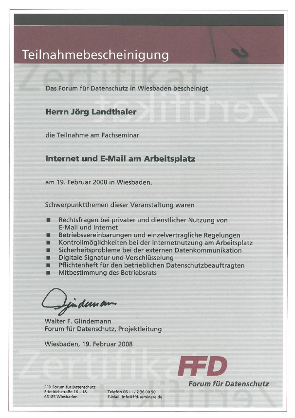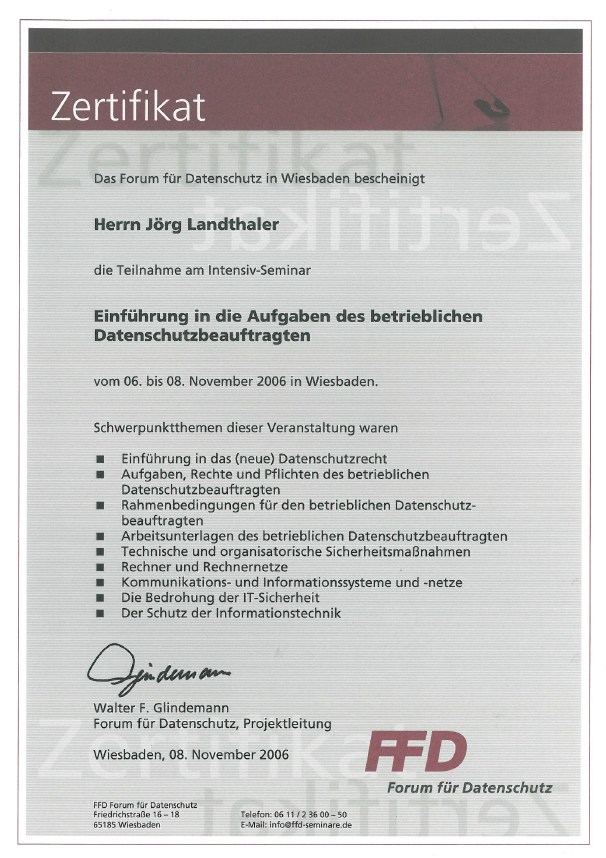 Diese Zusatzqualifikation verhalf mir 2006 zur Ernennung zum Datenschutzbeauftragten der Firma Senator.