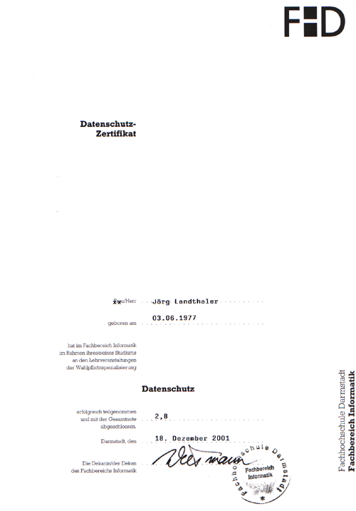 2001: Datenschutz Zertifikat FH Darmstadt